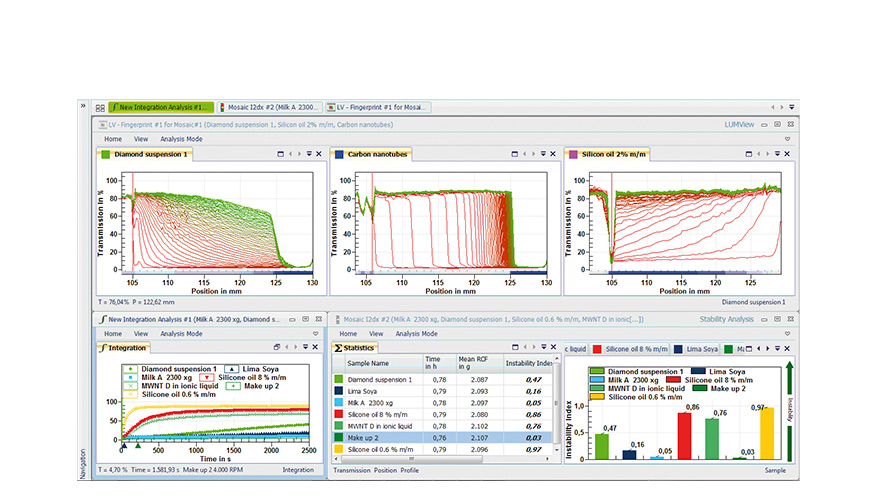 sowie das PSA-Modul für die Berechnung der Partikelgrössenverteilung. Das integrierte Animationswerkzeug gestattet die wiederholte schrittweise Anzeige der Messdaten zur leichten Identifikation auch komplexer Entmischungsphänomene mit einstellbaren Anzeigeparametern.